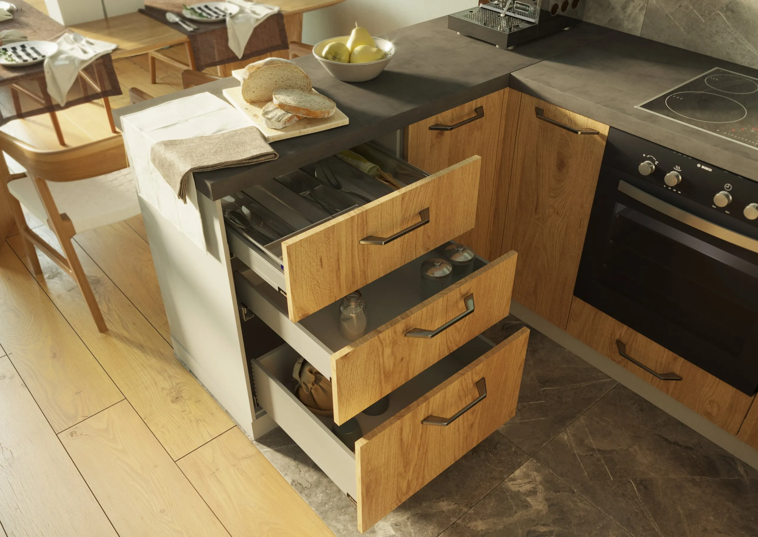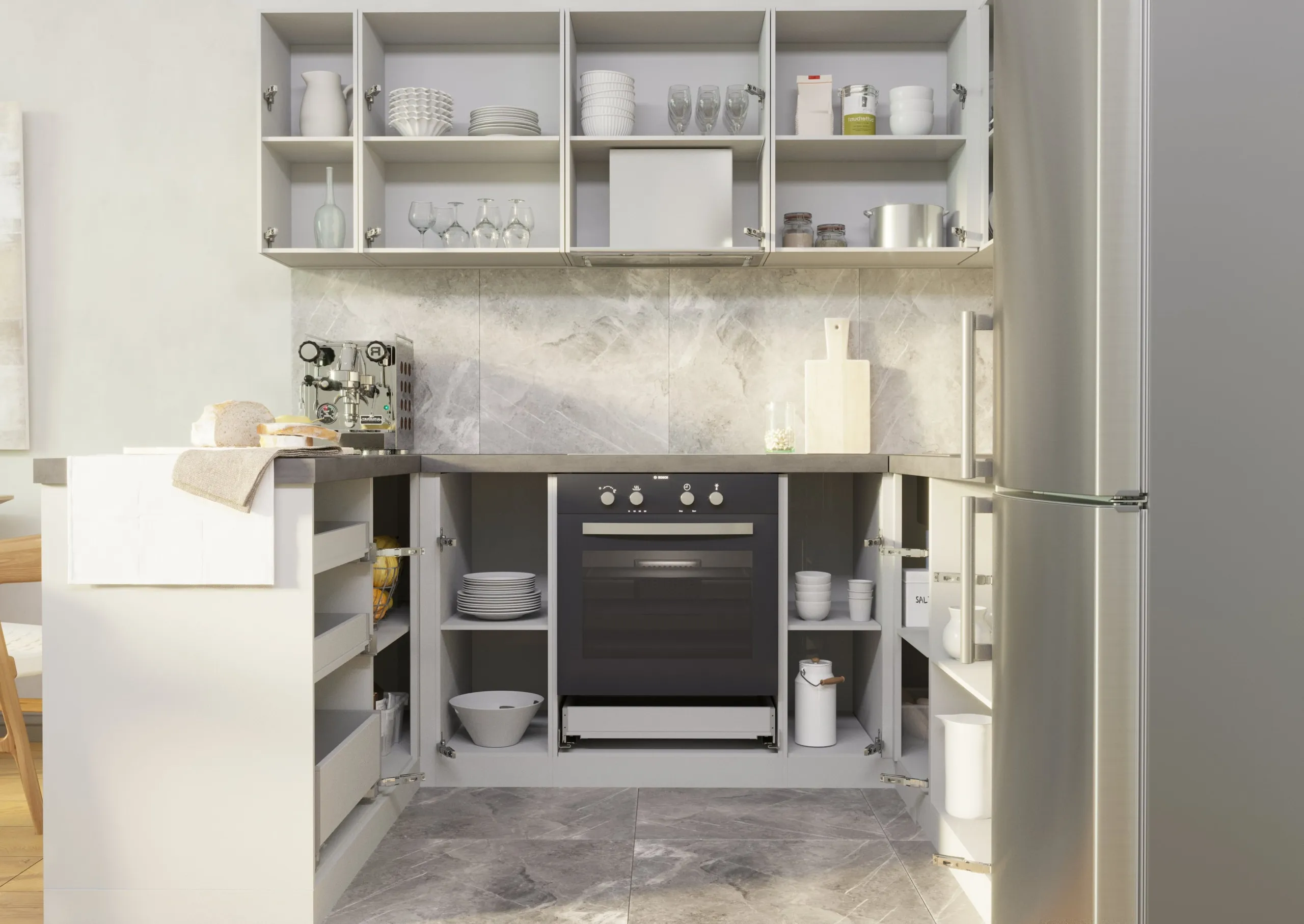 Механизмы открывания: петли BOYARD с доводчиком, направляющие Quadro 25 (Hettich)
