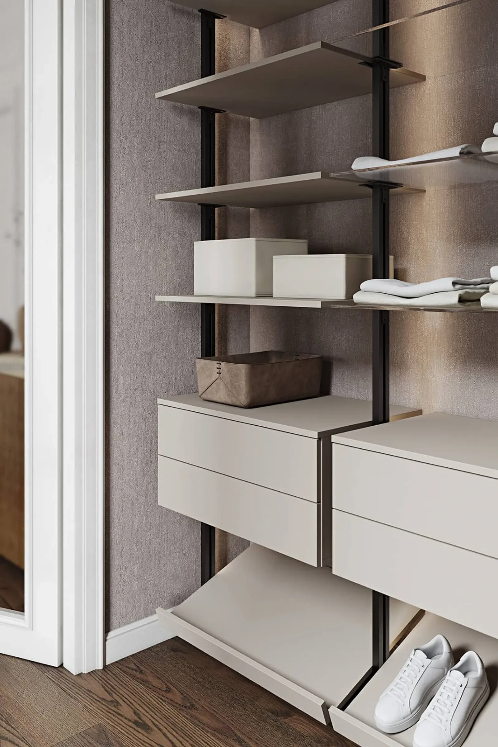 ОПОРНЫЙ ПРОФИЛЬ PA 02, цвет Черный Матовый НАВЕСНЫЕ ЭЛЕМЕНТЫ ЛДСП (толщина 18 мм), цвет Ярко-серый / стекло прозрачное (толщина 6 мм)