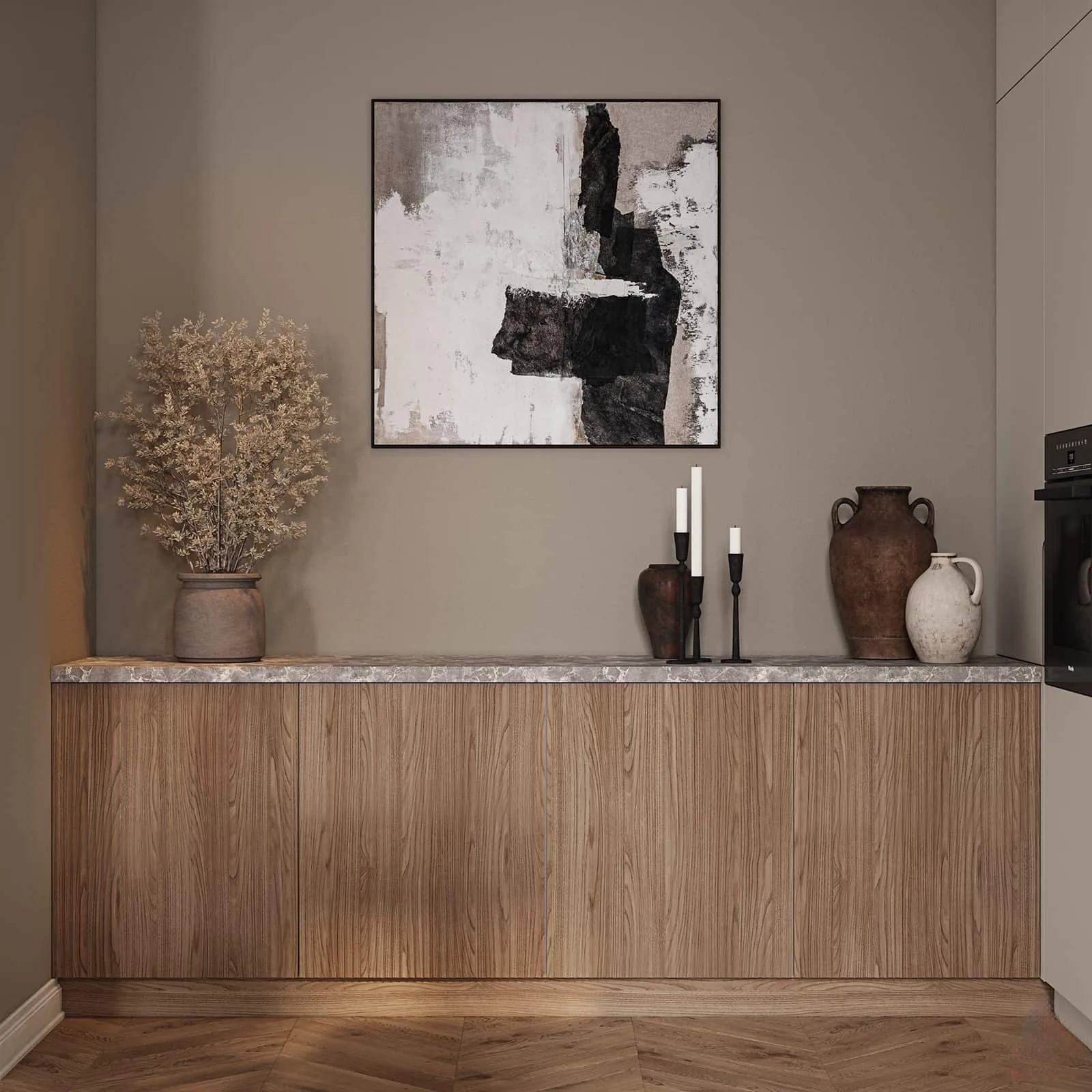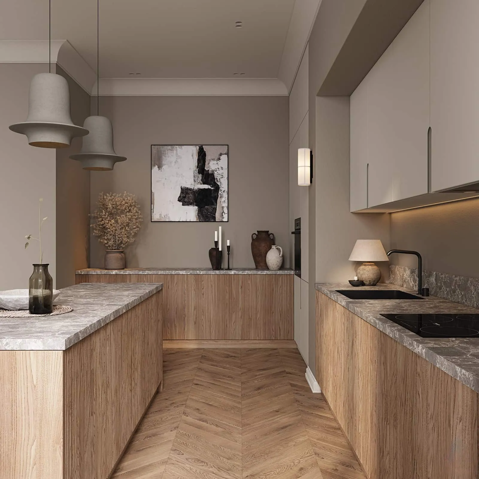 Фасады: T433 Шпон дуба, цвет #189 (воскобейц Белый); Т622 / T619 Крашеная МДФ, цвет NCS S 1002-Y Матовый.