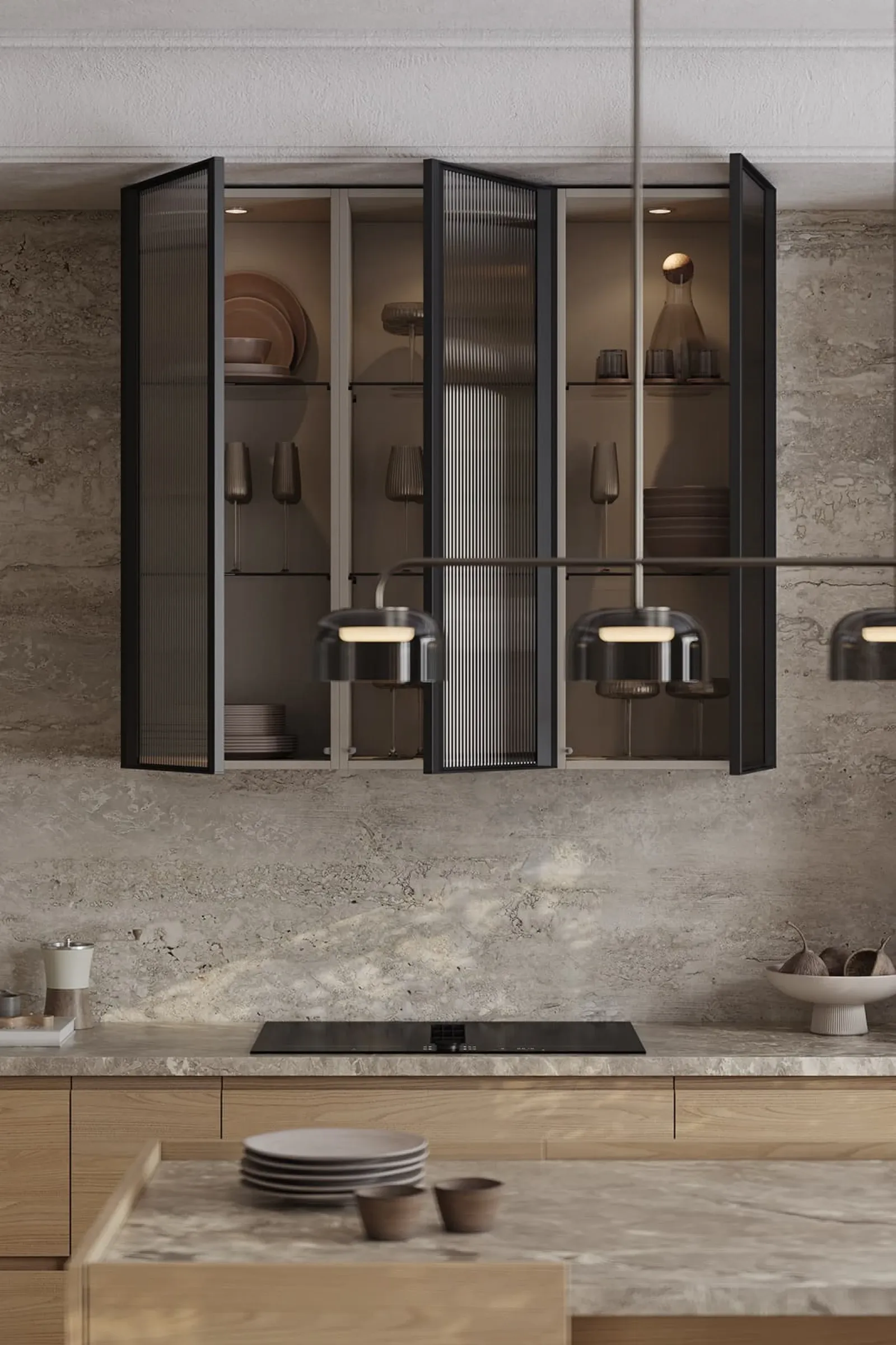 Фасады: Т422 / Т419Г Шпон дуба, цвет #183 (масловоск Бесцветный) / Т650 Крашеная МДФ, цвет NCS S 4005-G80Y Матовый