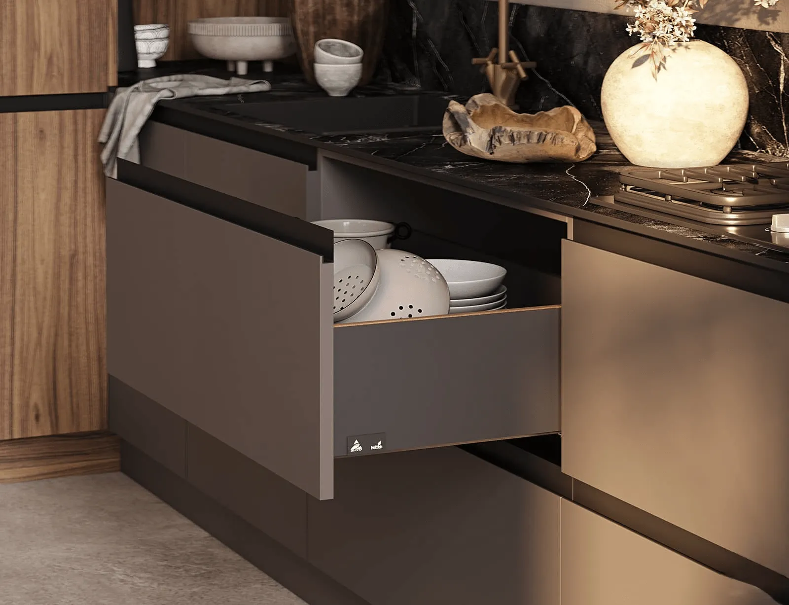 Внутри кухни ЛЕОНА используются фурнитура и выдвижные системы Hettich. Инновационные механизмыобеспечивают плавное и бесшумное открывание и закрывание ящиков и дверей кухонной мебели, а также максимальное использование пространства для храниения. Они также имеют высокую грузоподъемность, что делает их удобными для хранения тяжелых кухонных принадлежностей и посуды. Вам больше не придется беспокоиться о застревающих или сломанных ящиках, так как Hettich гарантирует качество и надежность.