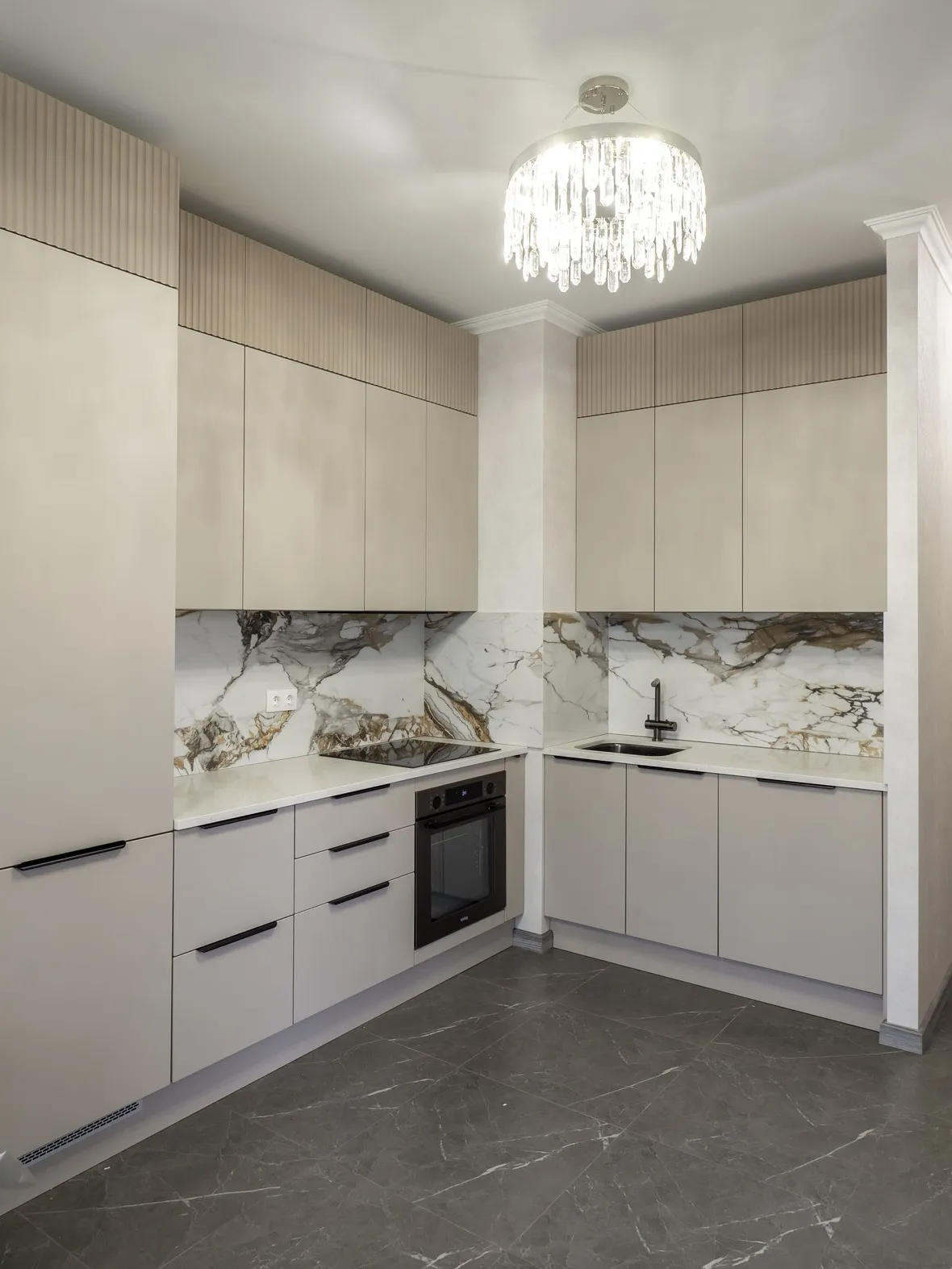 Техника: мойка и смеситель - EMAR, измельчитель - BONE CRUSHER, встроенный духовой шкаф, встроенная электрическая варочная панель, встроенная СВЧ, встроенная вытяжка, встроенная ПММ, встроенный холодильник - KORTING