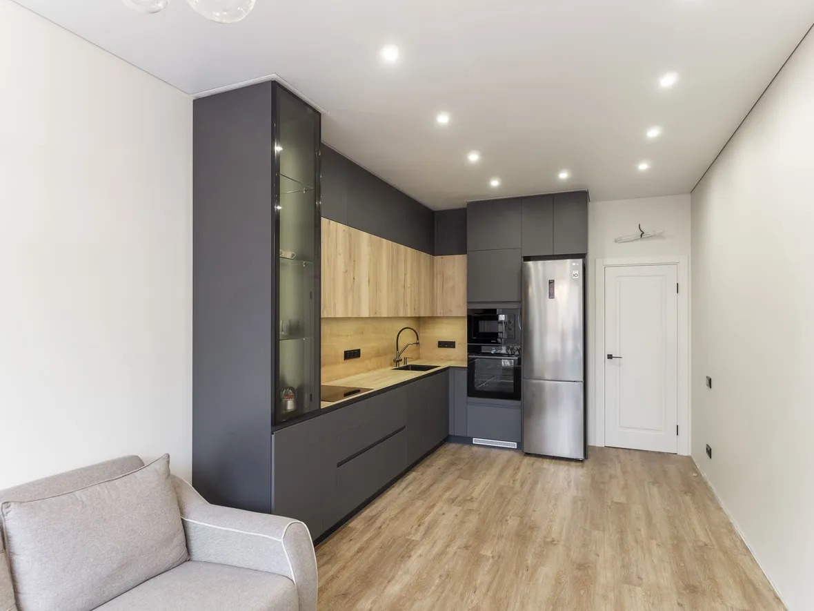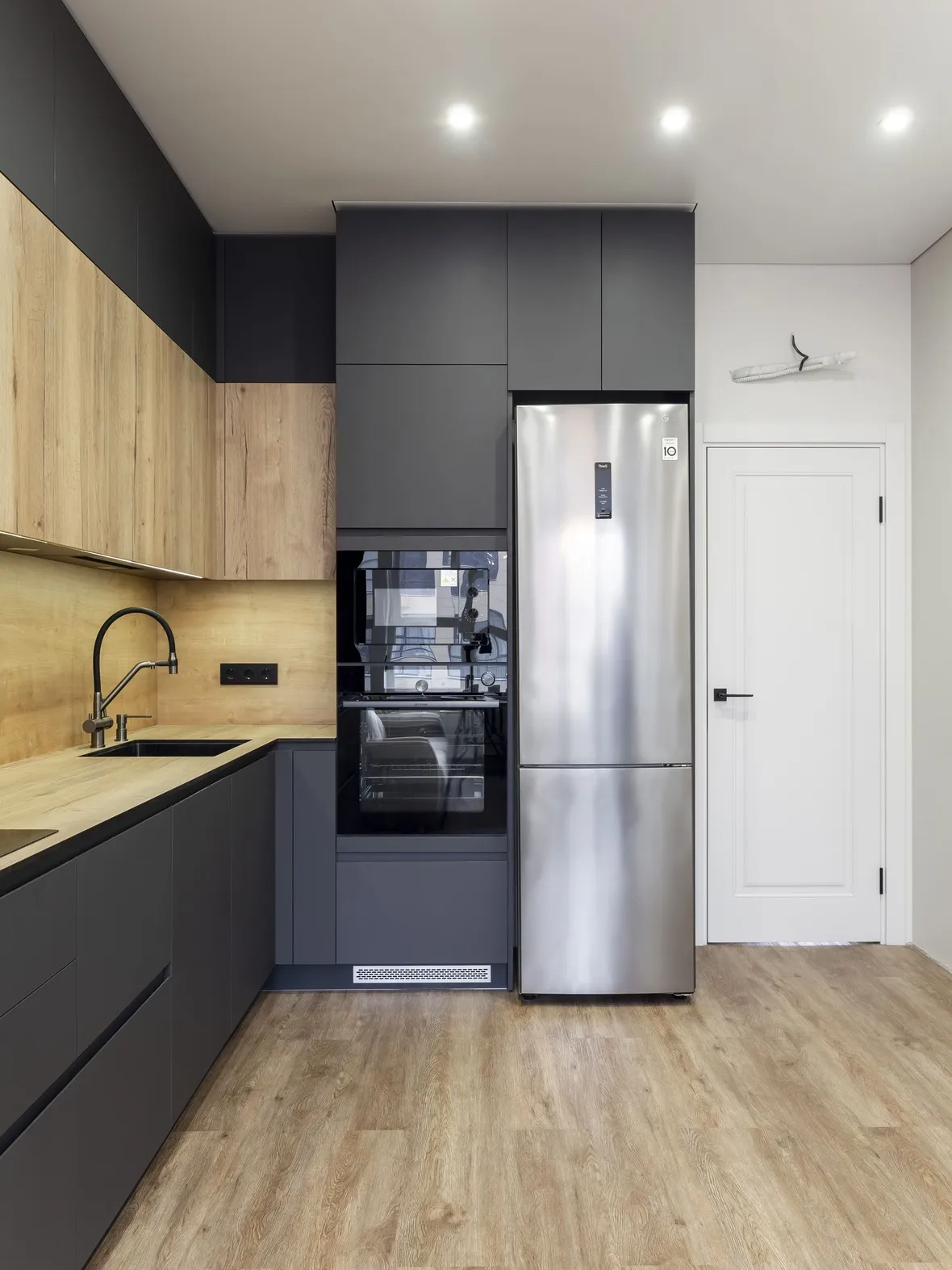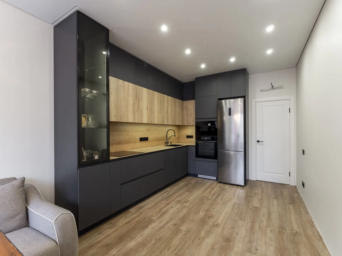 Техника: мойка и смеситель - EMAR, измельчитель - BONE CRUSHER, встроенный духовой шкаф, встроенная электрическая варочная панель, встроенная СВЧ, встроенная вытяжка, встроенная ПММ, встроенный холодильник - KORTING