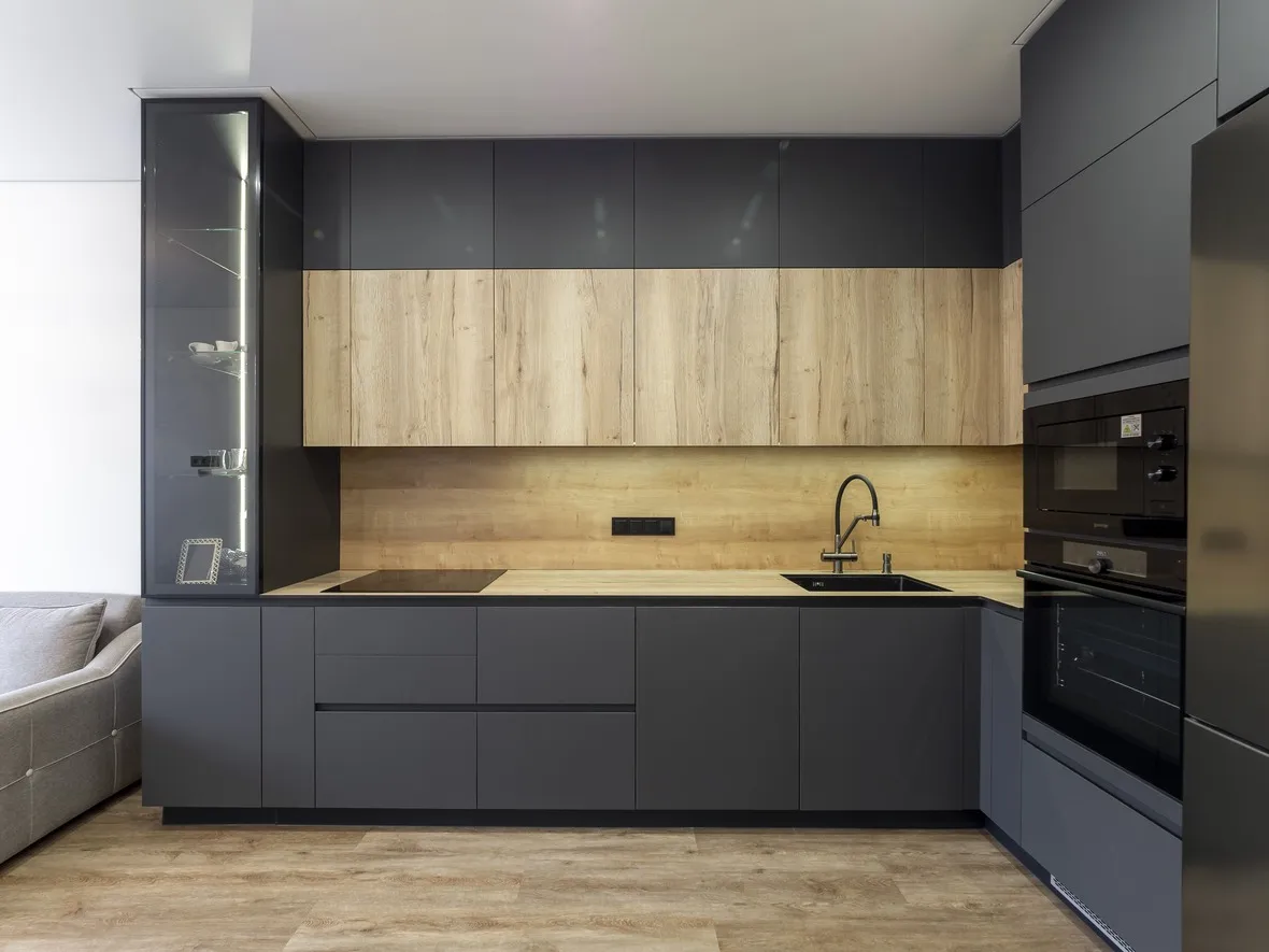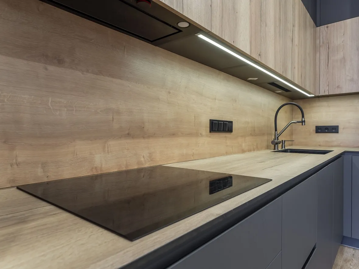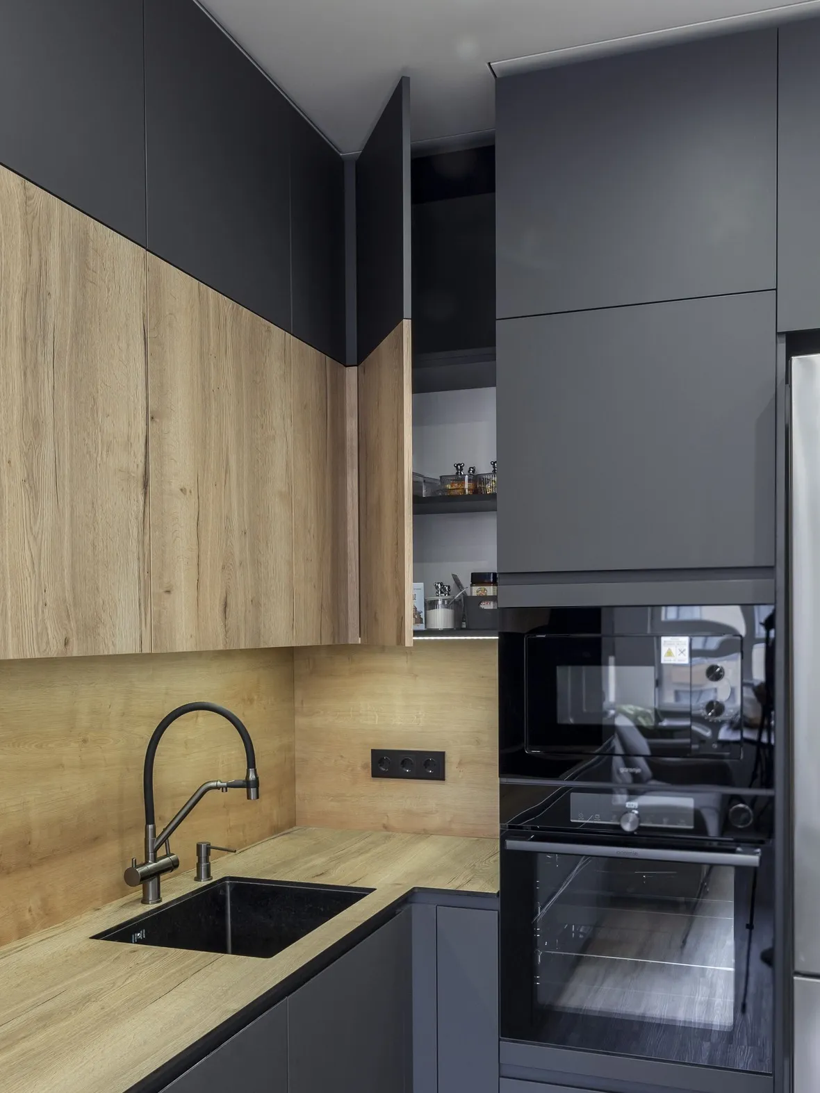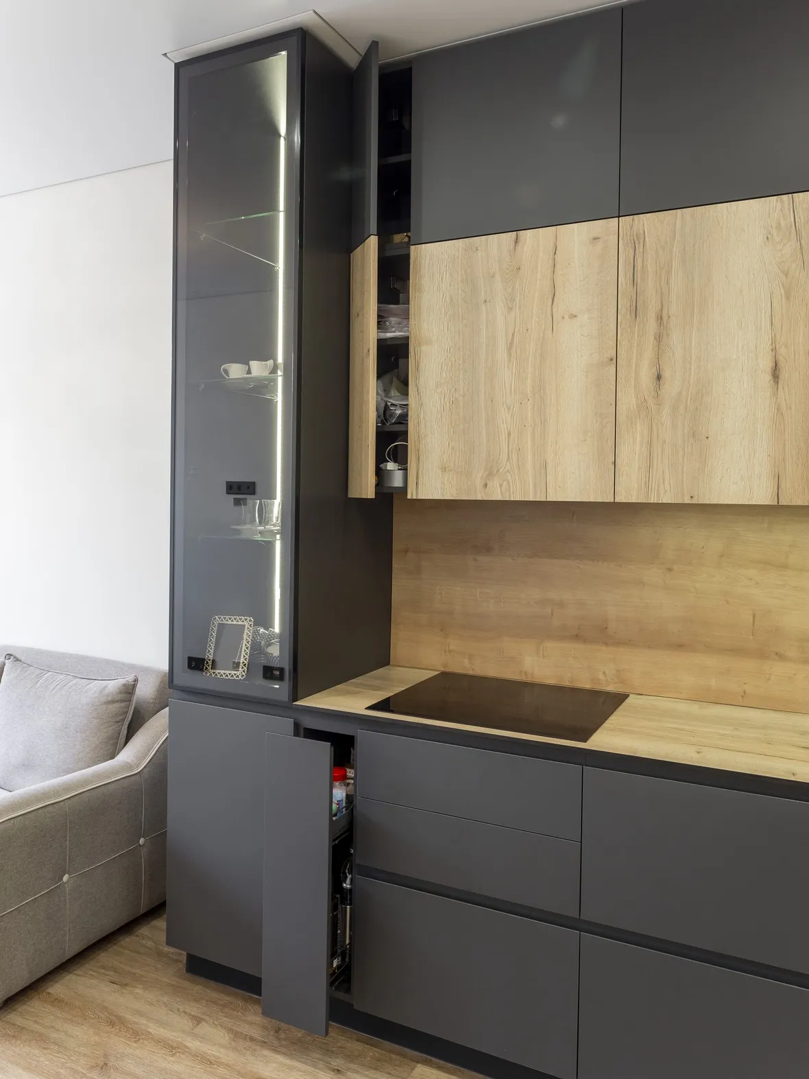Техника: мойка и смеситель - EMAR, измельчитель - BONE CRUSHER, встроенный духовой шкаф, встроенная электрическая варочная панель, встроенная СВЧ, встроенная вытяжка, встроенная ПММ, встроенный холодильник - KORTING